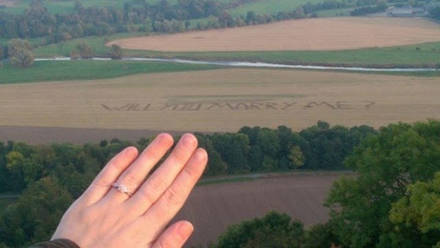 A minap olvastam, hogy egy fiatal skót gazda úgy kérte meg szerelme kezét, hogy a földbe szántotta a nagy kérdést, ami 100 méter hosszan és 24 méter szélesen terült el a férfi egyik őszi búza tábláján. Állítólag már a vetés idején eltervezte az akciót. Szegény, jó sokat izgulhatott aratásig, de persze a barátnője igent mondott.